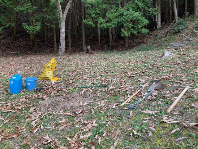1. まず最初にしなければならないのは岸根栗の苗木・肥料・灌水用水・穴太掘るための道具の準備です。