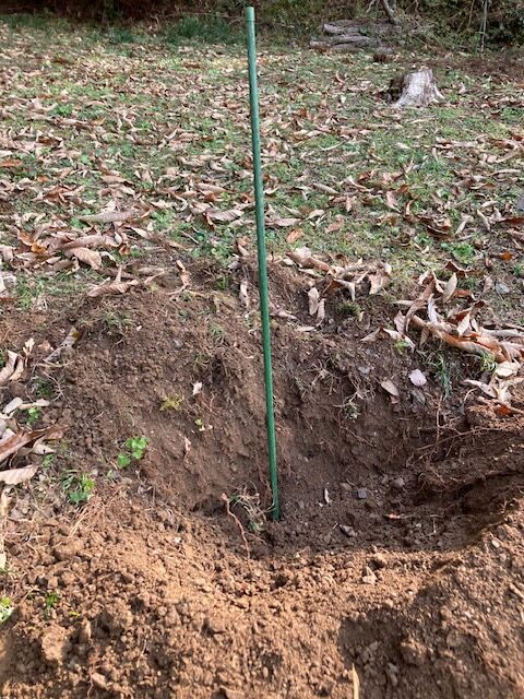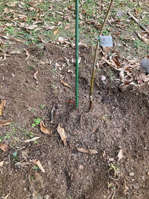5. そこに岸根栗の苗木と埋めて支柱を立てその後に植える苗木の周りの土を20cmぐらい盛ります。苗木を盛った土の真ん中に接ぎ木部分が隠れないように植えます。