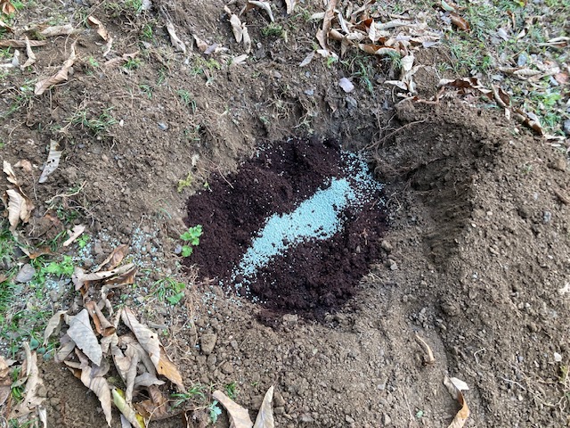 4. 掘った穴に肥料(溶燐・完熟堆肥)を入れて先ほど積み上げた土と川から汲んできた水を混ぜ合わせます。