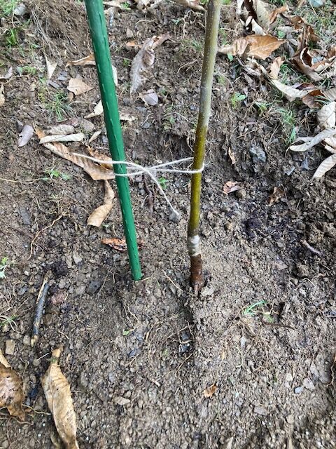 6. 最後にもう一度水をかけて支柱と苗木を紐で固定します。